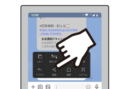 - お友達追加後、トークルームに流れてくるキャンペーンのメッセージを長押ししてください。