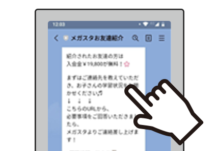 - お友達がご入会後、指導開始から2か月後に特典をお届けします。お友達は特典として入会金が無料になります。